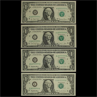 1977, 1988 & 1995 $1 Near Solid SN 15777777 four bill set Ch/Gem Unc.