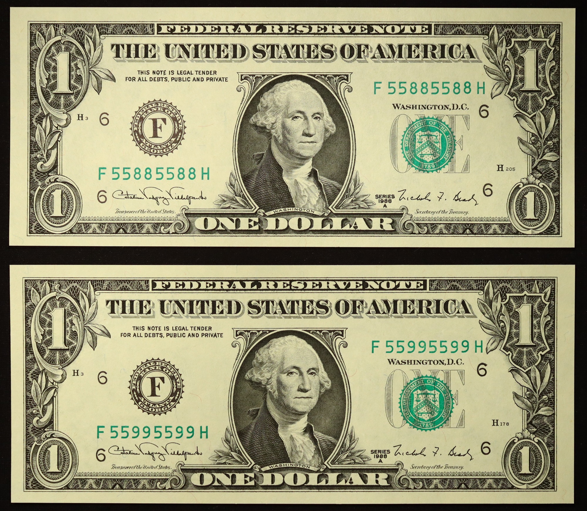 1988 A $1 Pair of Atlanta District Binary Repeaters 5588558 and 55995599 Gem Crisp Unc