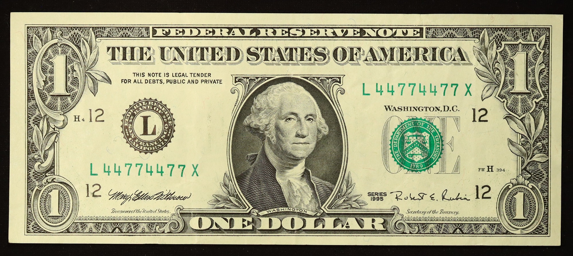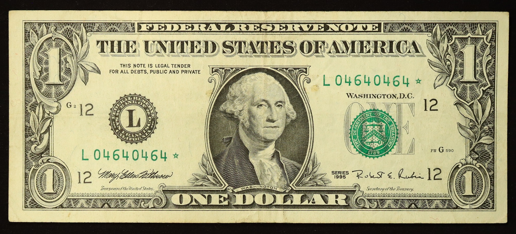 1995 $1 San Francisco District Federal Reserve Star Note Trinary Repeater 04640464 Lightly circulated