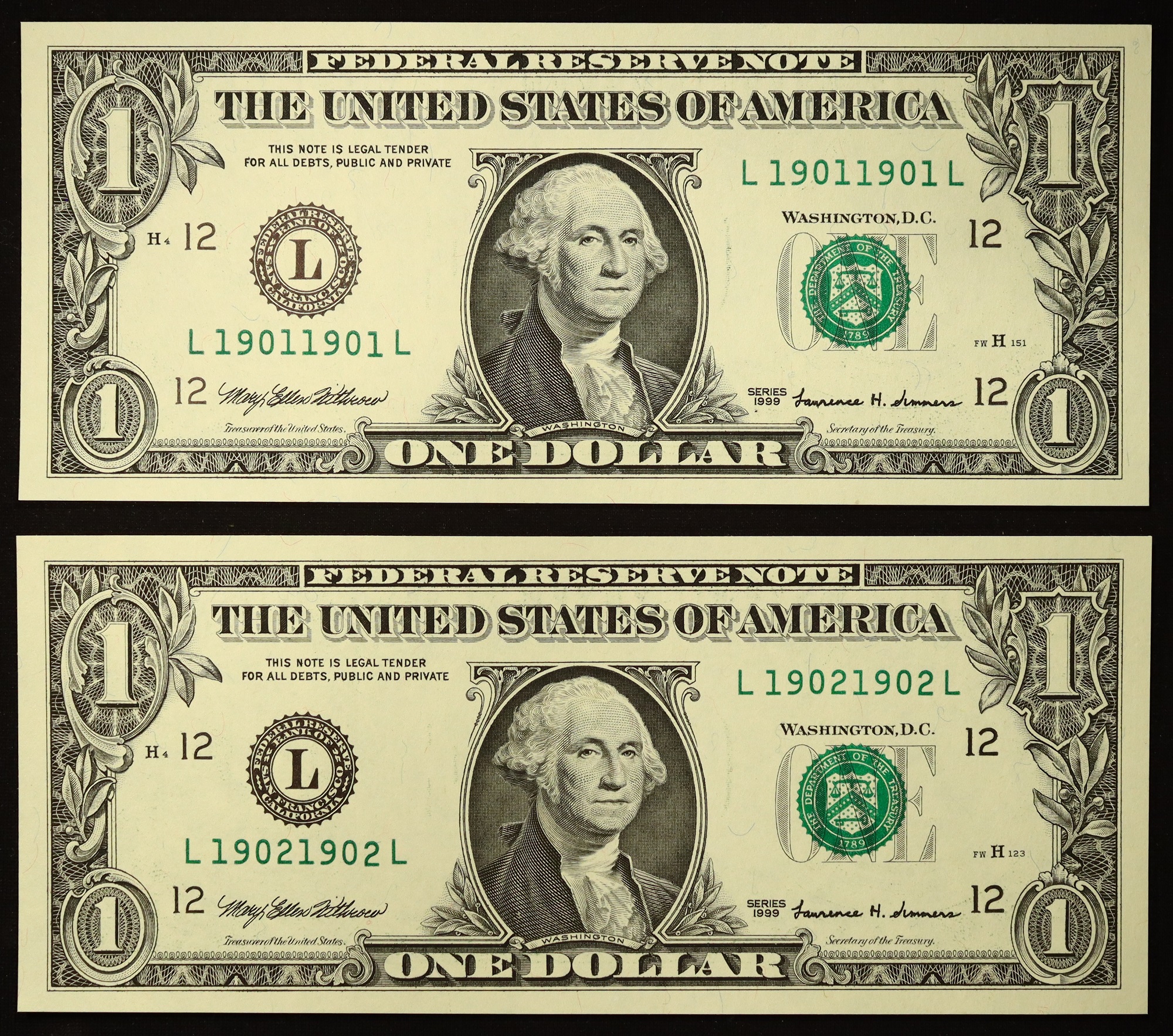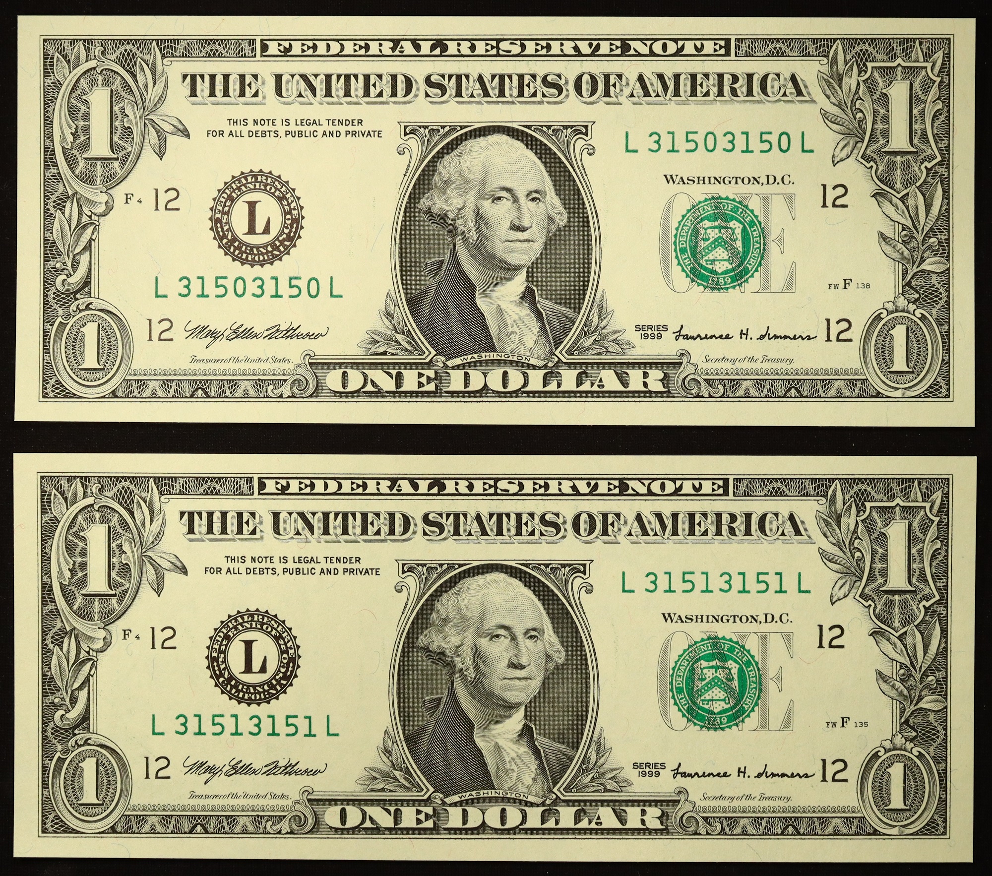 1999 $1 Pair of Federal Reserve Notes San Francisco District Repeaters 31503150 and 31513151 Gem Crisp Unc