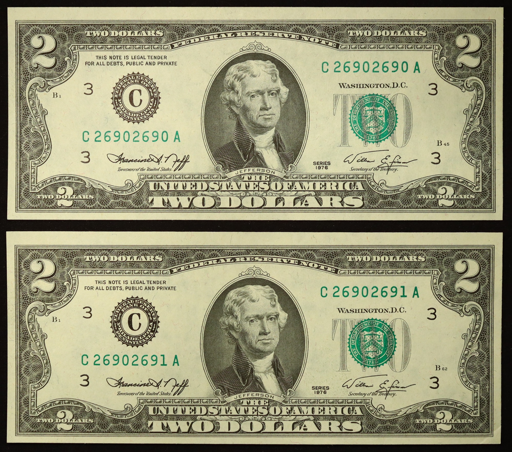 1976 $2 Pair of Federal Reserve Notes Philadelphia District Repeater and Next 26902690 and 26902691 Gem Crisp Unc