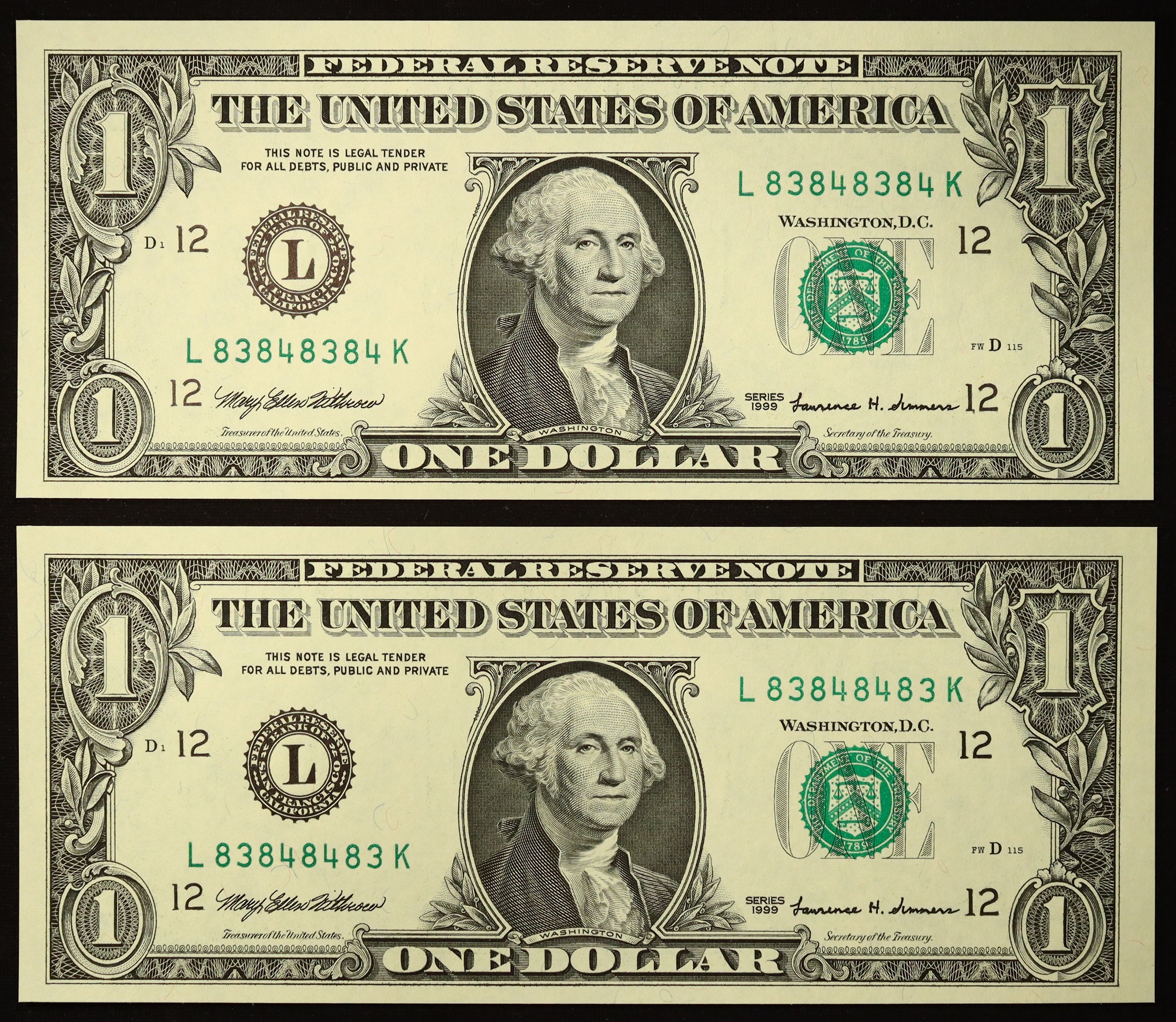 1999 $1 Pair of Federal Reserve Notes San Francisco District Matching Repeater and Radar 83848384 and 83848483 Gem Crisp Uncirculated